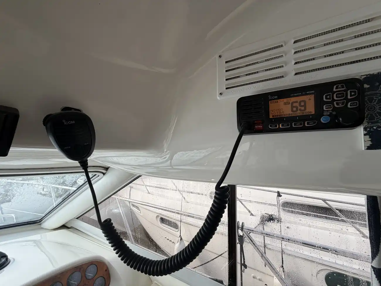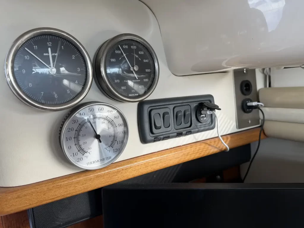 Gauges • Fuel level • Engine RPM • Engine water temperatures • Engine oil pressures • Charging volts • Steering position indicator • Stern drive tilt and trim • Trim tabs control • Raytheon Tri-data , speed/depth/trip • Compass • Raytheon RN 300 GPS • Shipmate RS400 VHF • Bow-thruster joystick (and remote)