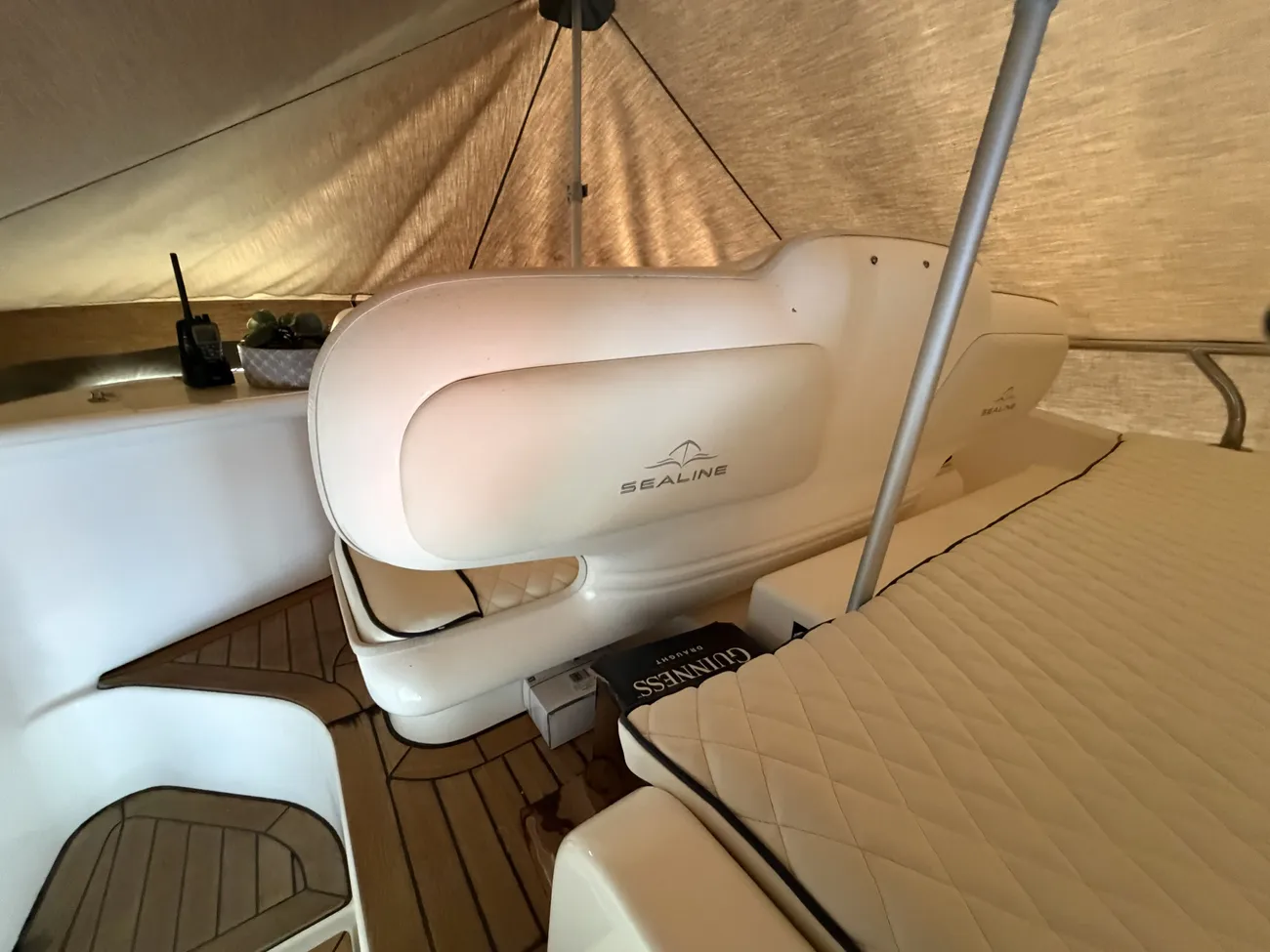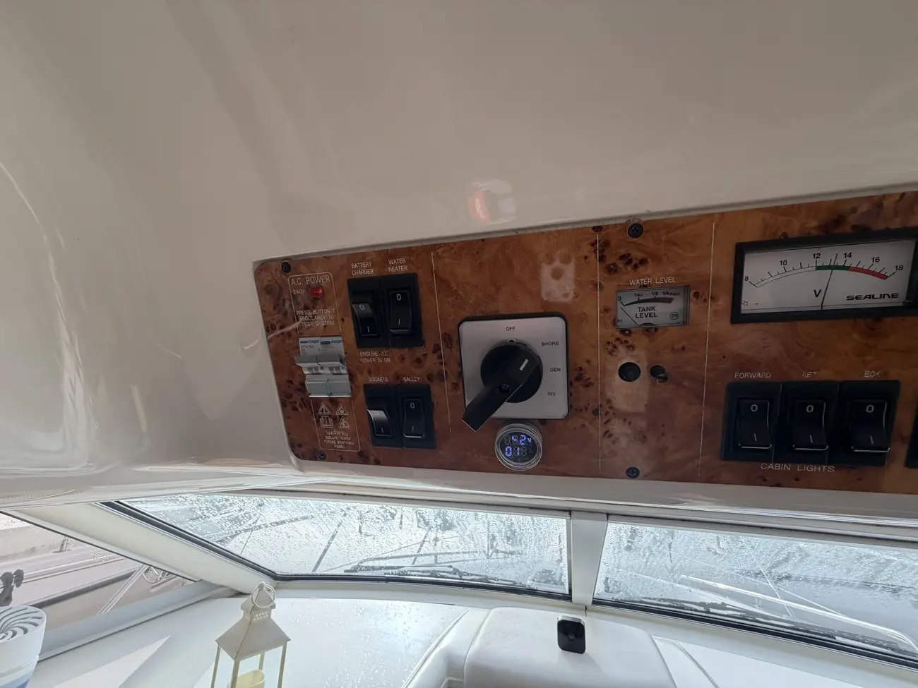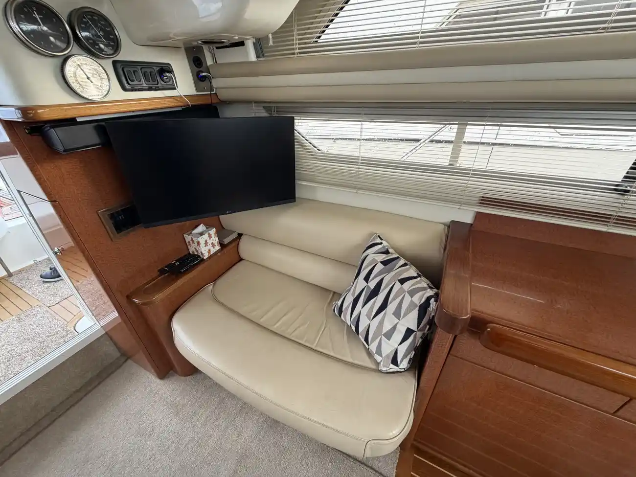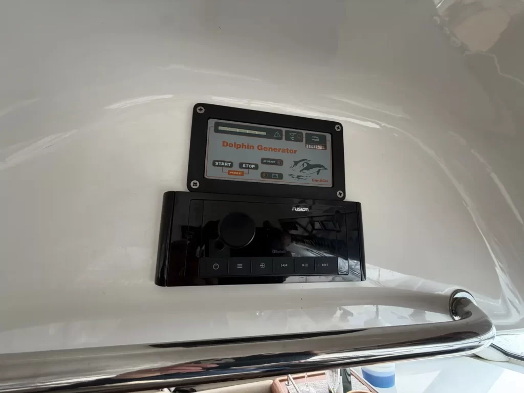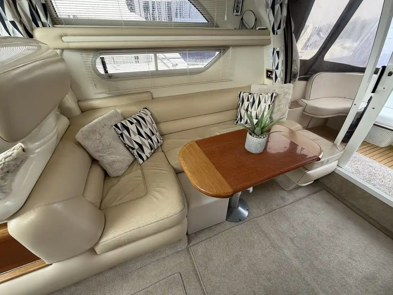 Saloon fully soft lined throughout • Carpet & curtains • Fully upholstered ‘L’ shaped seating area • Saloon table • Overhead storage lockers • Overhead lighting • Lower helm to starboard • Bilge access hatch in floor • Eberspacher heating control • Electrical panel for 230v & DC circuit • “Marine Air” aircon to saloon and main cabin • Matching Sealine Barometer and clock • Dolphin 4kw generator (in lazarette) • 230v Aircon (Marine Air) • New Fusion entertainment system with speakers • TV• fire extinguishers • fire blanket • bilge pump in fwd bilge. Vectron battery monitor.