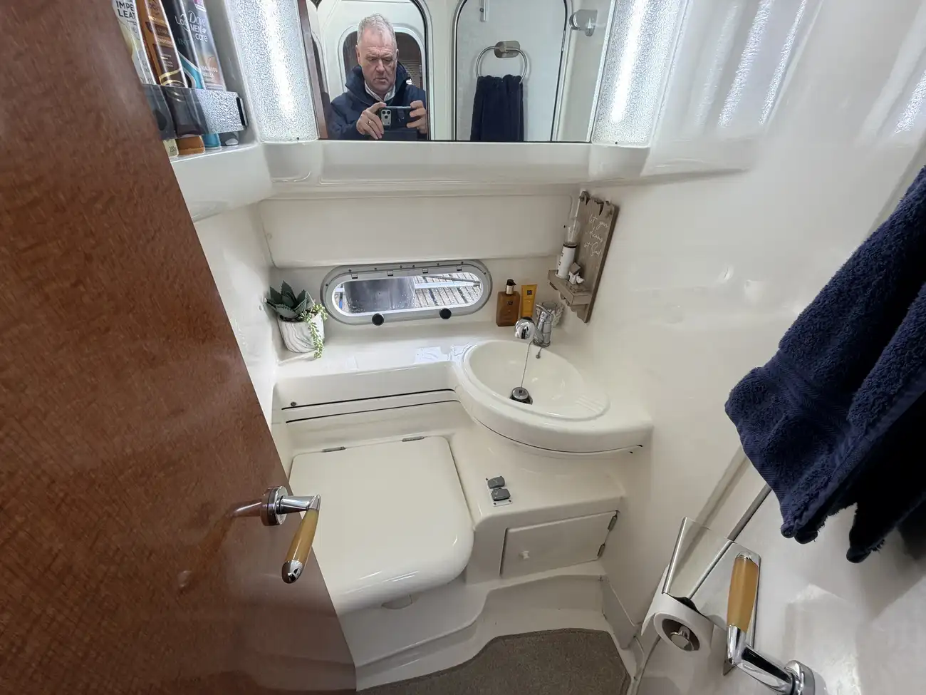Large toilet compartment with ensuite facility to saloon and forward cabin • Electric Toilet • Hand basin • Mixer/shower tap with pressurised hot & cold water • Vanity unit with storage compartments • Toilet roll, towel and toothbrush holders • Overhead lighting • Mirror • Shaver socket • Opening window
