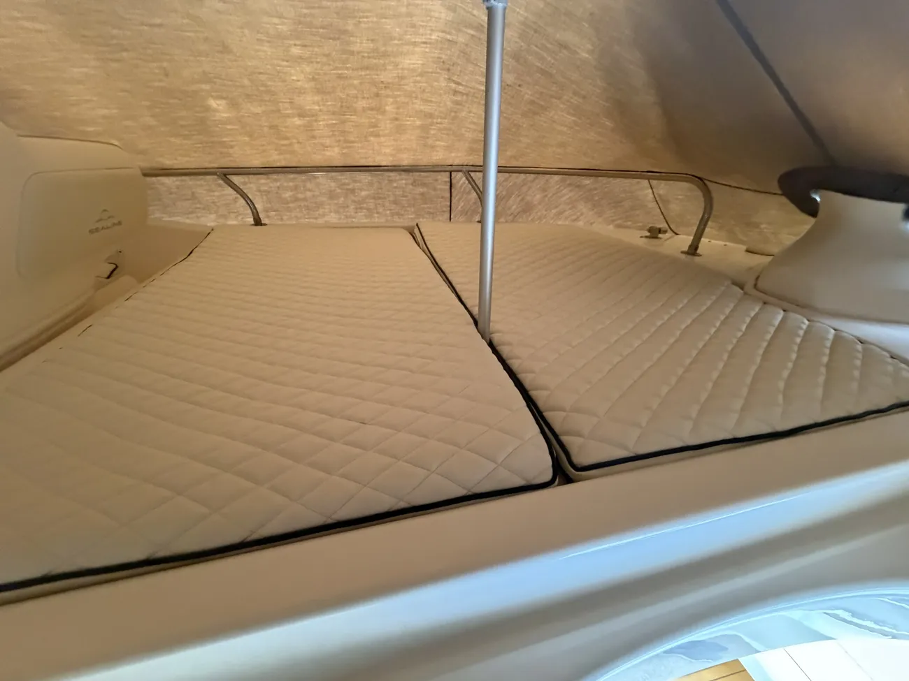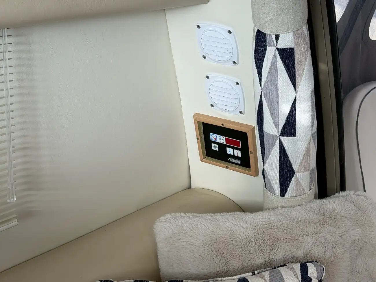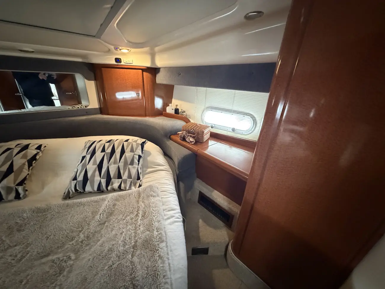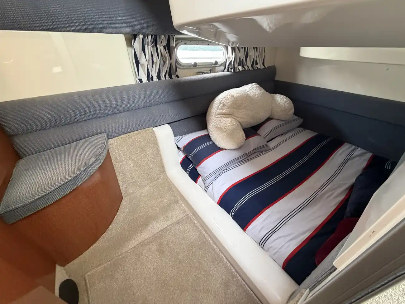 Fully soft lined throughout • Carpet & curtains • Large fully upholstered Island double berth • Hanging wardrobes with shelves • Storage drawers • Storage cupboards • Mirror on forward bulkhead • High level storage shelf and cupboards • 220V sockets • 12v Sockets • Opening windows • Opening hatch to deck
