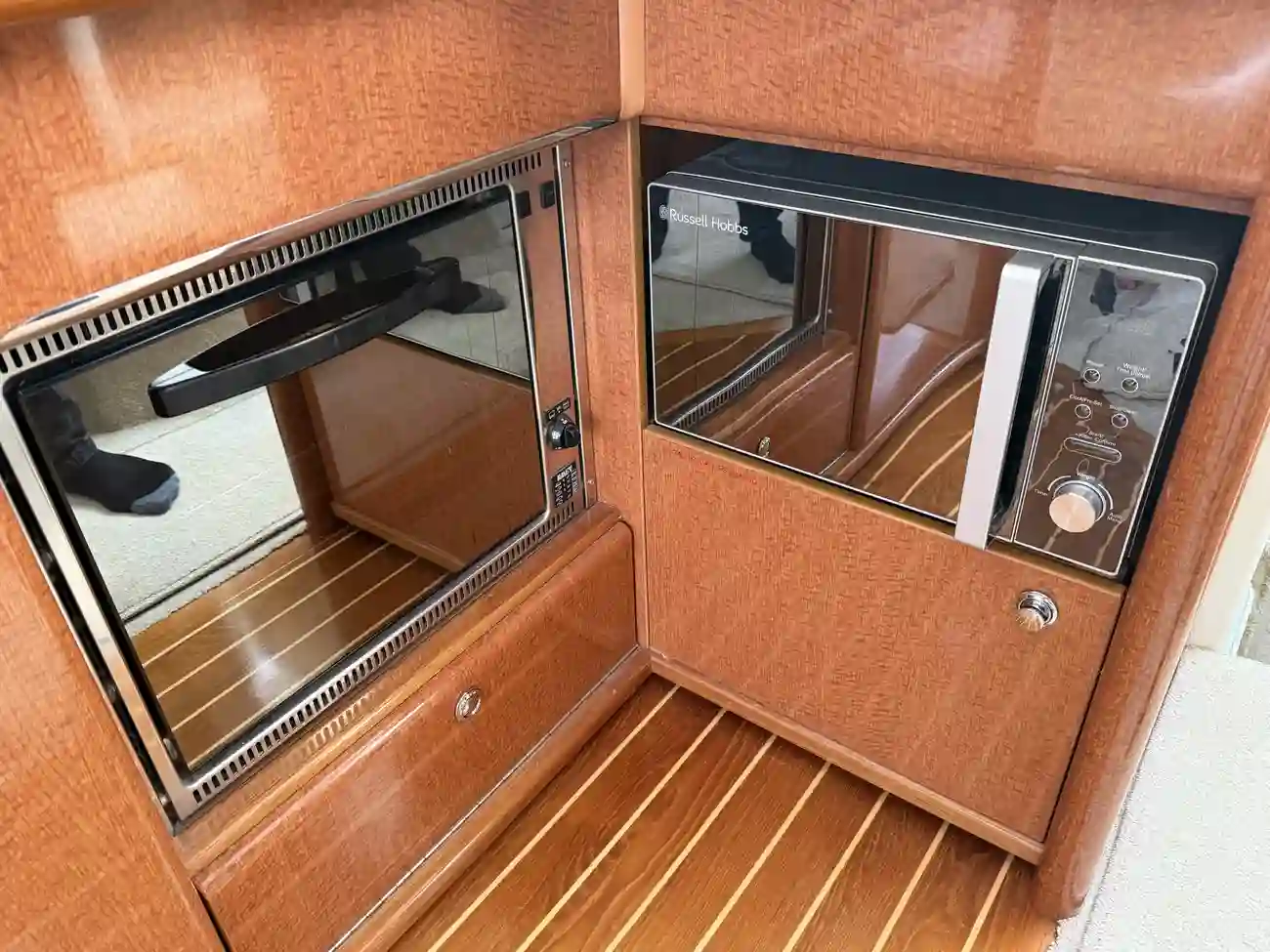 Deep stainless-steel sink • Mixer tap, pressurised hot & cold water • Hob (x2 burner) • Oven and grill •Russell Hobbs Microwave • Large fridge (12v/230v) • Low level storage cupboards • Overhead lighting • Opening window • Teak and holly finished floor)