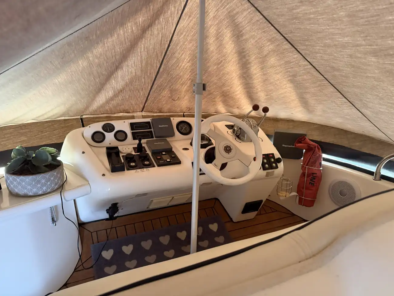 Triple helm seat • Twin morse throttles • Rev counters • Anchor windlass control • Morse change over • Instrument cover • Teak laid self draining floor • New Sun pad • Stainless steel handrails • Engine RPM • Steering position indicator • Stern drive tilt and trim • Trim tabs control & Trim indicators • Raytheon Tri-data , speed/depth/trip • Compass • Raytheon RN 300 GPS • VHF Shipmate RS400 VHF • Bow-thruster joystick • Spotlight controller .Speakers